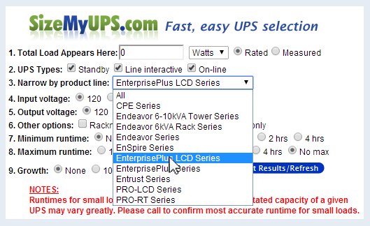 Minuteman’s SizeMyUPS.com is an excellent resource for properly sizing an EnterprisePlus LCD UPS for your system. Simply select your equipment from the extensive database, or enter your loads if they are already known. Then select EnterprisePlus LCD from the Narrow by Product Line dropdown to see the solutions available for your application and the estimated runtimes they will provide.